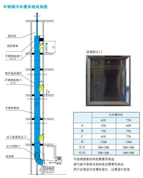 污衣井是采用進(jìn)口優(yōu)質(zhì)不銹鋼加工焊接而成。槽管以角形圓環(huán)接口結(jié)合,允許各層樓的槽管在高度上的尺寸和冷縮熱脹的情況。在每一層樓,槽管以鍍鋅鐵地臺(tái)固定架支承,并用螺栓錨固于地臺(tái)上。污衣井在所需的樓層提供的投物門為側(cè)鉸、雙層門,可以加配電控門鎖,也可以人手操作。
